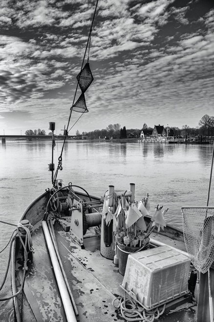 Een fraai in zwart-wit omgezette foto vanaf een schip wat je het ultieme gevoel geeft