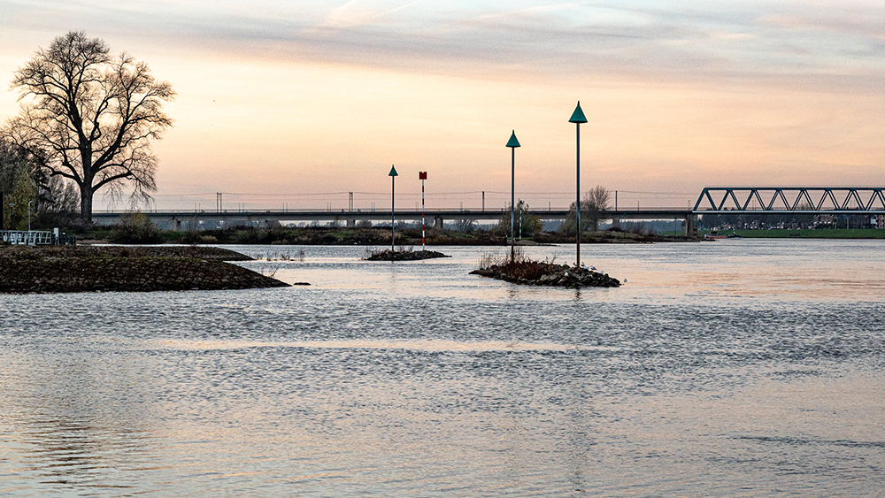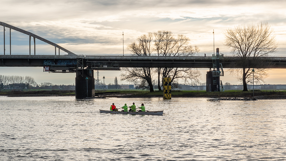 Een fijn beeld van de rivier de IJssel die van linksonder naar rechtsboven door het landschap slingert. Doorsneden door de spoorbrug waar de trein rijdt, een mooi moment om te laten zien dat het passeren van de rivier tot het dagelijks leven behoort.