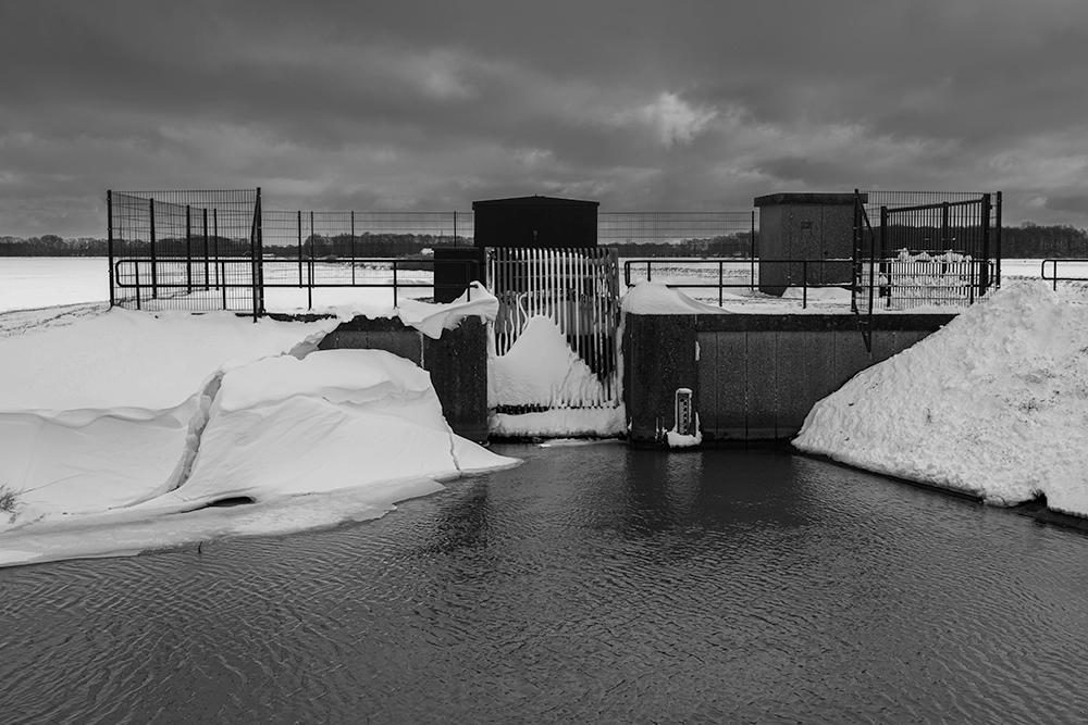 Foto nr. 24 van Ed Koekkoek heeft de 3e plaats IJssel en Meer, dan gaat het over water. Deze foto in een echt Hollandse sneeuwsetting, in een krachtige vormgeving, geeft een bijzondere kijk op dit, vaak verscholen, waterwerk. Het zwart-wit versterkt de mooie verstilling. De sneeuw geeft iets extra’s, maar ook dat onze aandacht gaat naar het water toe getrokken wordt. De focus op deze infrastructuur krijgt hierdoor een extra ‘spanning’. Het mooie is dat ook die ogenschijnlijke zo eenvoudige waterwerken heel belangrijk zijn in onze waterhuishouding. Een mooie invulling van “Wie het kleine niet eert….” Goed gezien.